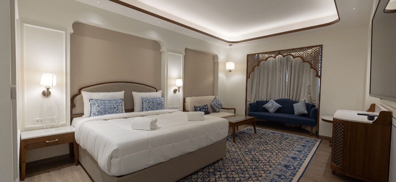 Inspired by Mandakini—the celestial name of the Ganges before it touches the earth, these 365 sq. ft. havens offer a tranquil retreat. Whether you choose a plush king size bed or cosy twin beds, these beautifully appointed rooms surround you with warmth and serenity. Modern comforts like air-conditioning, a 55-inch television, and a tea & coffee maker elevate your stay, while their inviting aura encourages you to unwind and reset. Perfect for travellers beginning their Haridwar journey, these rooms near Alaknanda Ghat offer a blend of soulful charm and contemporary ease.